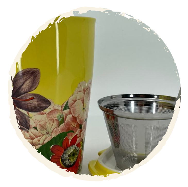 Stylish and functional dual wall ceramic mug with ceramic loose lid which serves as a drip catcher for the fine sieve infuser basket (included) after brewing. Mug serves as a great hand warmer and beautiful conversation piece.