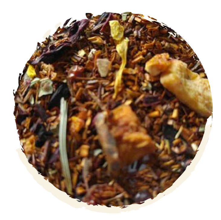 No Caffeine – Organic Ingredients: Red Rooibos, peach strands and ginger root